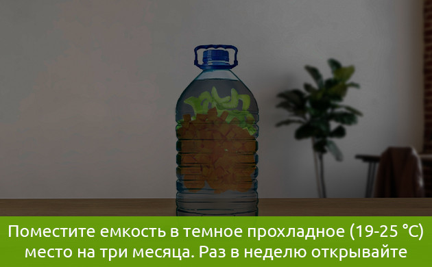 - Поместите емкость в темное прохладное (19-25 градусов Цельсия) место на три месяца. Раз в неделю открывайте контейнер и выпускайте из него образовавшиеся в процессе брожения газы.