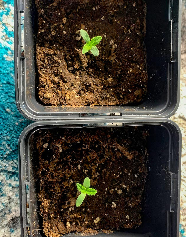 Тем не менее развитие RS 11 x Banana OG идет полным ходом. Оба растения выпустили широченные листья и вытянулись уже почти до 10 см в высоту. Если бы основной бокс был свободен, то их бы уже можно было пересаживать в большие горшки и ставить под яркий свет, но пока что вся жилплощадь там занята. Полив пока только водой, но, судя по всему, скоро нужно будет начинать вводить удобрения.