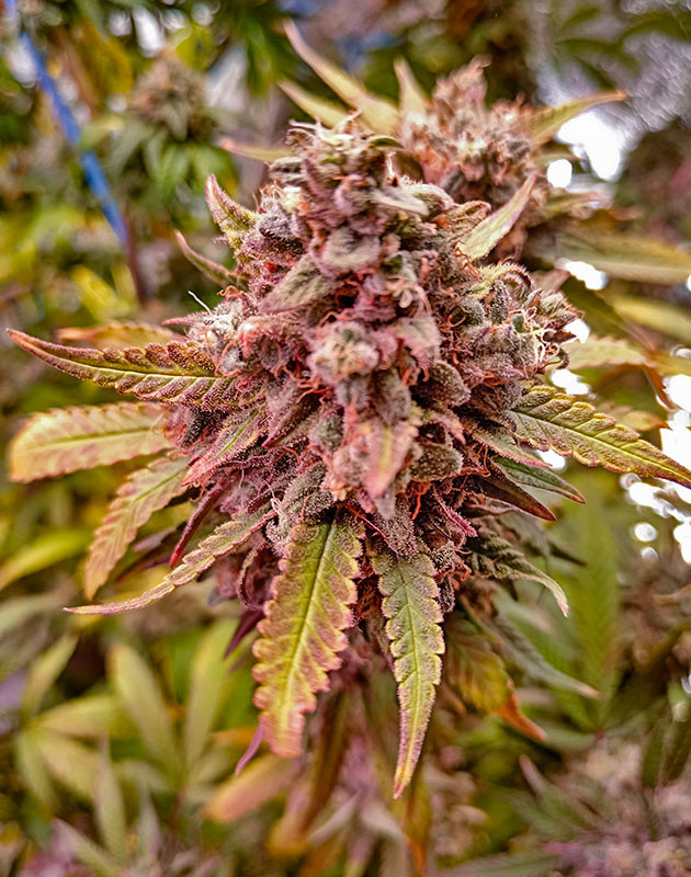 Автоцвет созревает и обваливается в трихомах. Кстати, смоляных желез довольно много для автоцветущей генетики. Структура у бутонов плотная, а приятный фиолетовый оттенок листьев и шишек радует глаз. Кстати, колы стали настолько тяжелыми, что начинают изгибаться и провисать. Пришлось немного пошаманить с поддержкой.