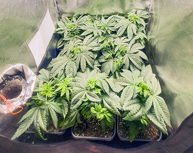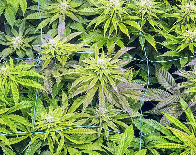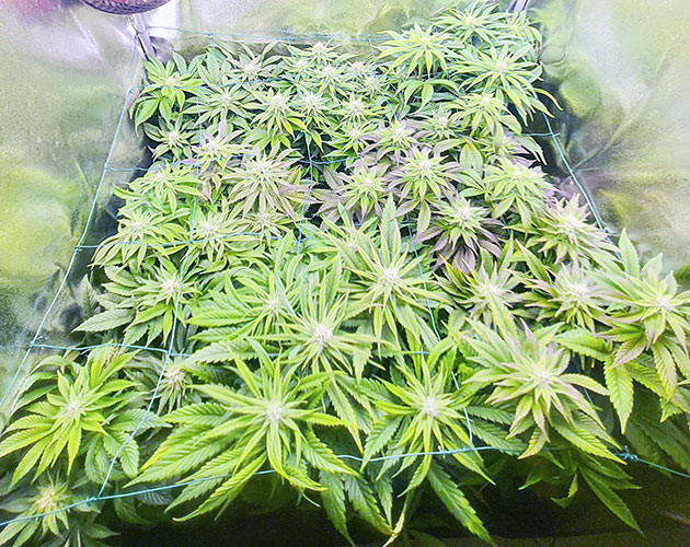 Растения не переставали тянуться, а переход на цветение занял чуть больше времени, чем я рассчитывал. Как бы там ни было, когда средний рост кустиков был в районе 60 сантиметров, над ними была натянута сетка ScrOG, чтобы в дальнейшем развести колы в отдельные ячейки. Кусты стали получать по 3 литра воды или компота за полив. Просыхают за 3-4 дня, а поливаю все по той же схеме: Bio Enhancer – Bio Bloom – чистая вода. Развожу по 1 грамму удобрений на литр. Пока меня всё устраивает, кустики выглядят здоровыми, и никаких проблем с ними не возникает.