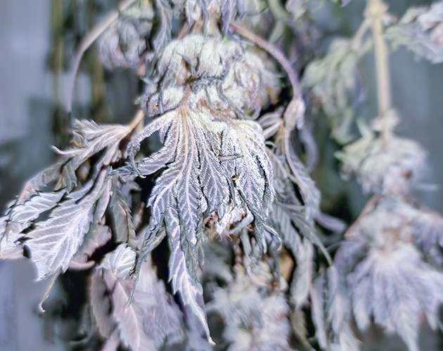 Процесс уборки урожая занял целый день, учитывая, что рубить надо было восемь кустов. Делал все постепенно, не спеша. Растишки Biscotti Mintz разделил на ветки и развесил сушиться отдельно от остальных. Перед сушкой удалил откровенно пораженные листья, остальные оставил и срезал через пару дней, когда они немного просохли. После 6 дней сушки я отделил соцветия от ветвей и разложил их на газете еще на сутки. Конечный итог с двух кустов – 121 грамм роскошных бутонов.