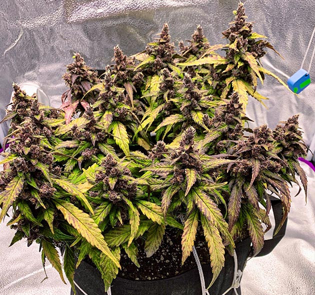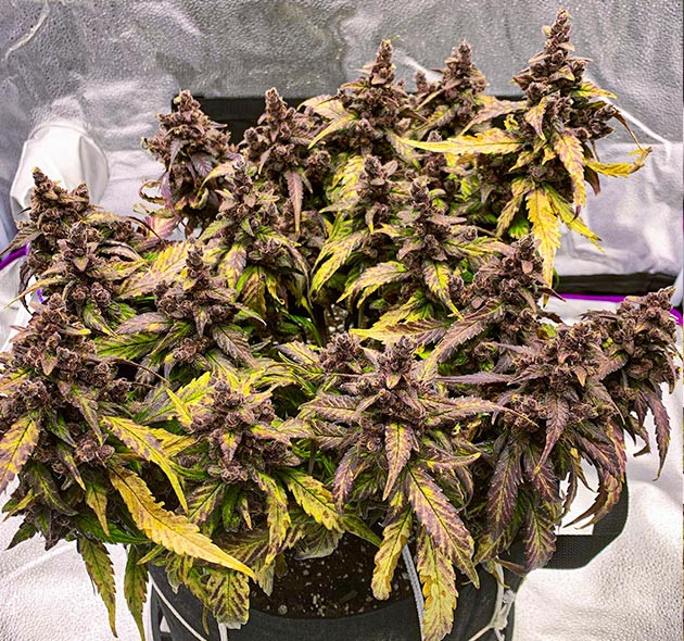 К концу восьмой недели листья стали менять цвет еще стремительней, что меня даже немного напугало. Передо мной был куст с черными шишками и тёмно-красно-фиолетовыми листьями. Цвет насыщенный, чем-то напоминает базилик. Продолжаю давать воду три раза в неделю, но постепенно снижаю количество. На этой неделе лил по 3 литра. Запах стал еще сильнее, хотя казалось, что сильнее уже некуда.