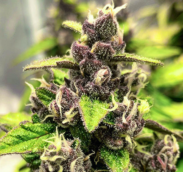 На седьмой неделе начали появляться первые янтарные трихомы на сахарных листках, но на шишках еще встречались даже прозрачные. Запах невероятно сильный, очень приятный ягодный аромат. Очень впечатлен развитием куста в целом и рад, что мне попался фенотип с фирменным черным оттенком, который придает растению особый шарм. Причем цвет именно черный, местами тёмно-фиолетовый.