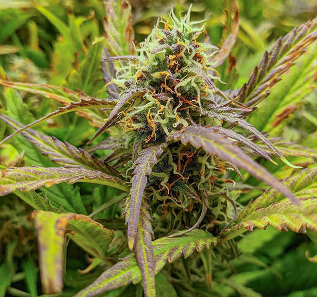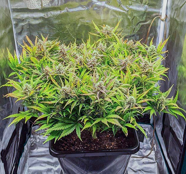 К концу девятой недели растишка перестала тянуться, и я решил снять сетку. Высота кроны составляла где-то 45 сантиметров. Куст продолжает много пить, но уже не в таком количестве, как во время первых недель цветения. Сахарная листва начала постепенно менять цвет. Много верхних листиков пострадало от светового ожога. Таким образом, на верхушках получилась разноцветная палитра из жёлто-коричнево-фиолетовых листьев. Волоски на шишках начали менять окрас на десятой неделе, но при осмотре трихом янтаря я пока не заметил.