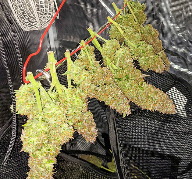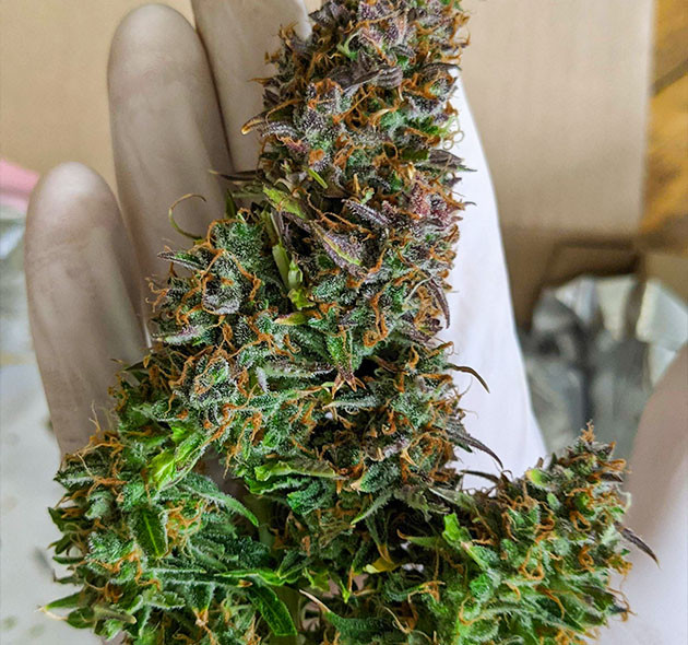 13-я неделя стала завершающей в моём грове. Я дождался появления янтаря в трихомах. Его было не очень много, но прозрачных трихом не осталось совсем, а значит, мой кустик созрел. Листва на шишках была фиолетовая, по оттенку напоминала базилик. Оставил на пару дней без воды, затем на сутки в темноте и срубил куст.