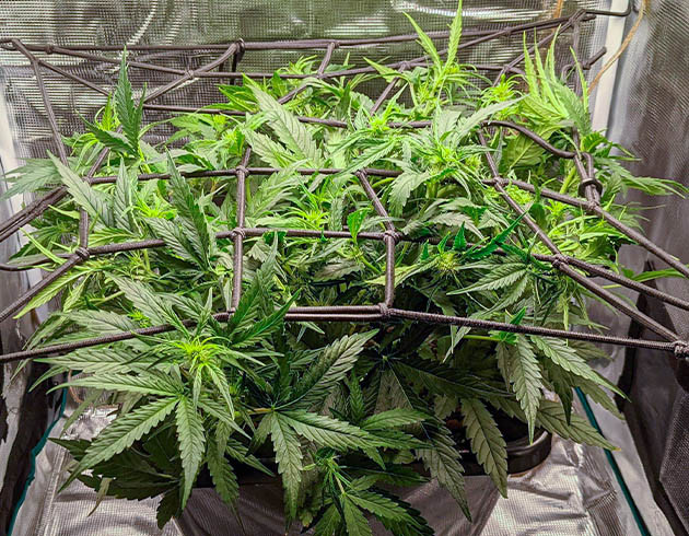 В начале пятой недели установил сетку скрог, чтобы формировать более широкую крону куста по мере его роста. Отметил, что из-за автополива в тенте очень высокая влажность. Угольный фильтр пока включать нет смысла, потому что никакого запаха еще нет. Поэтому я периодически включаю вытяжку без фильтра на 2-3 часа. Такое нехитрое действие помогает снизить влажность до приемлемых показателей.
