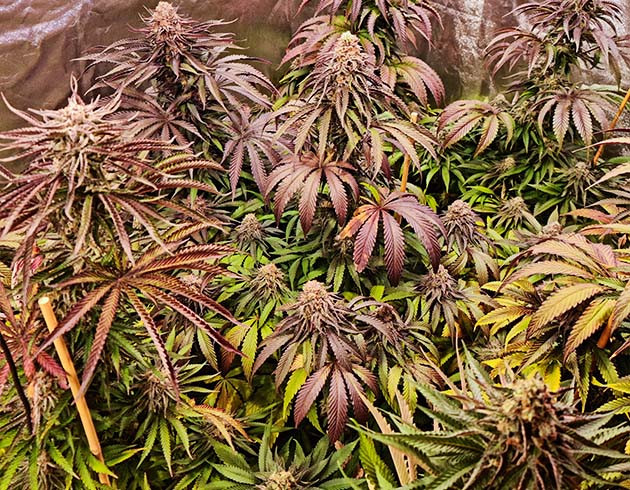 Продолжаю повышать уровень СО2, доведя его до 1200 ppm. За счет этого девочки больше пьют, как следствие, в боксе повышается уровень влажности. Осушитель воздуха работает на максимум, благодаря чему удаётся удерживать влажность на уровне 40-50 %. К этому моменту большие кусты были выше метра, меньшие не доросли до метра. Некоторые растения, вне зависимости от фенотипа, начали приобретать фиолетовый оттенок на макушках и кончиках листвы. В боксе стоит мощный аромат, что совсем неудивительно: сорт пахучий, а тут целых 18 кустов.
