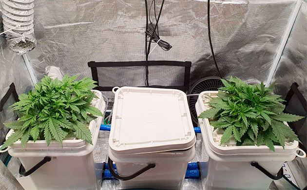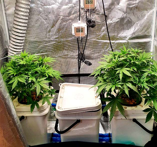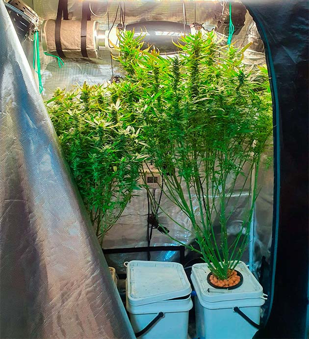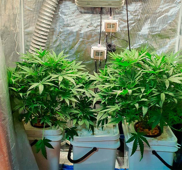 Выращивал на гидропонике под светодиодной панелью на 250 W. Горшки DWC на 20 литров, плюс общий резервуар. Присутствуют все необходимые датчики для контроля микроклимата, вытяжка активная, приток воздуха пассивный через форточки в палатке.