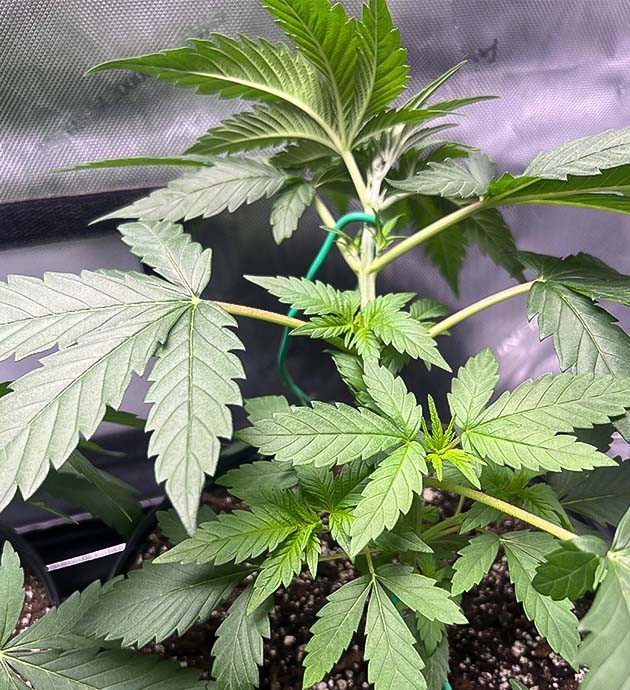 После того как кустики просохли от полива, начал делать LST. Использую мягкие резинки для денег и проволоку, аккуратно растягиваю в разные стороны и обязательно закрепляю у основания стебля отдельной резинкой. Сама методика LST такая. Сначала я слегка разминаю пальцами то место, где планирую сгибать растиху. Гну медленно, постепенно, чтобы ничего не сломать и даже не надломить. Обязательно закрепляю макушку на уровне остальных побегов, чтобы они развивались одинаково.