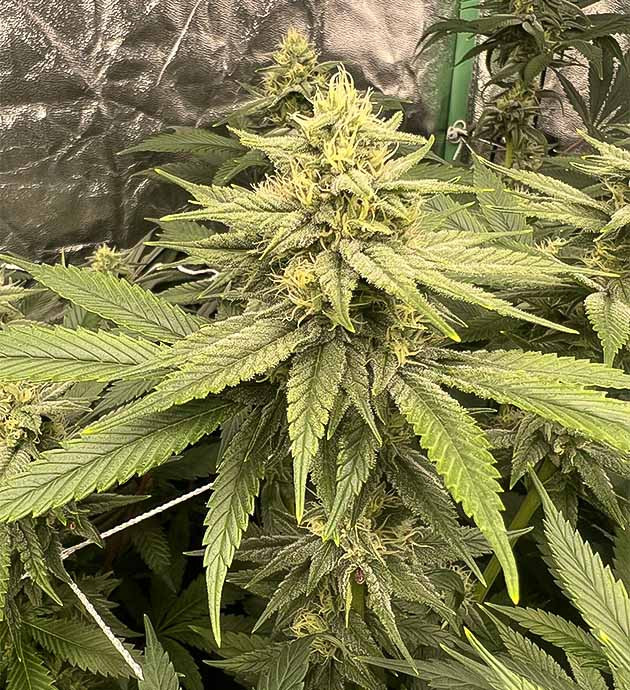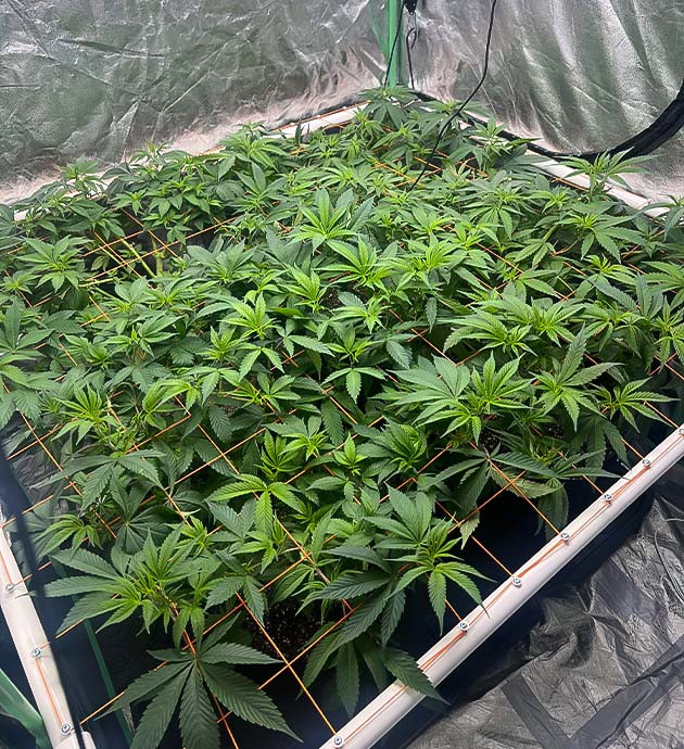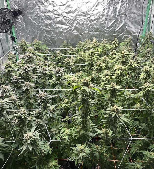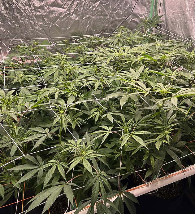 Итак, на седьмой неделе всё было готово к цвету. Но я был вынужден подождать еще немного, так как был сильно загружен бытовыми делами. Начал устанавливать сетки скрог и постепенно разводить колы по ячейкам, хоть времени у меня было и не особо много. По ходу убирал немного листвы на кустиках. Обычно делаю более обширную дефолиацию перед цветом, в этот раз решил оставить побольше зелени. К концу недели я закончил «настройку» ScrOG, все колы были разогнуты в отдельные ячейки, лишняя листва удалена, место для боковых ветвей предусмотрено. Кусты получили по две порции удобрений, 4 литра за один полив: