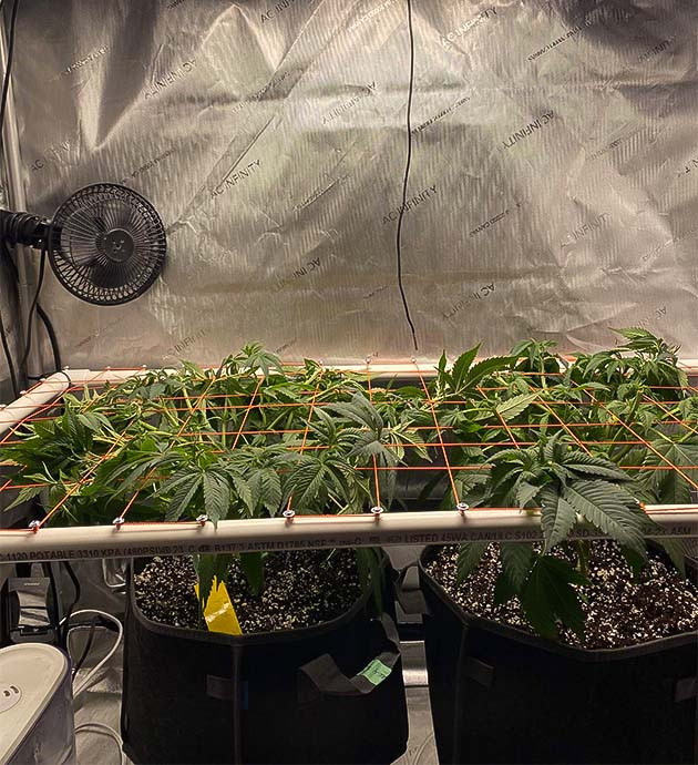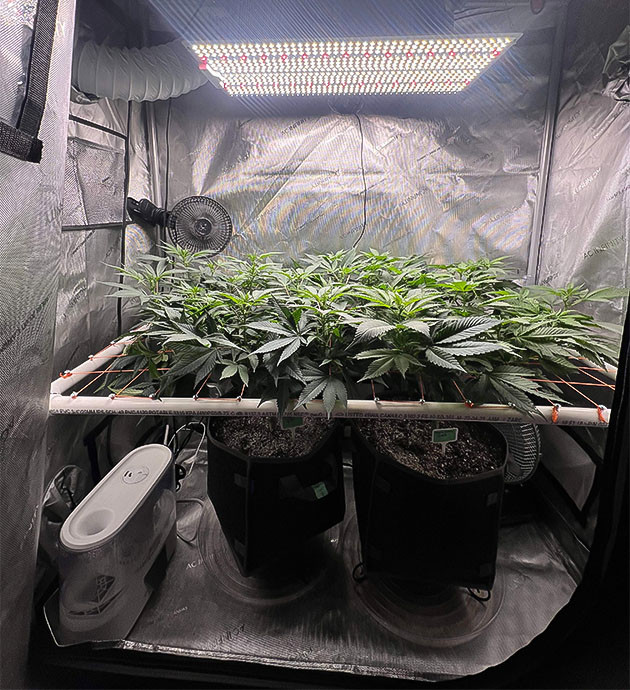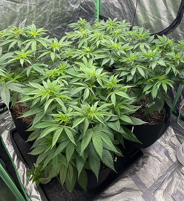 В начале шестой недели почистил нижние этажи кустиков от мелких веточек и листвы, после чего пересадил их в большие горшки. Два кустика в 25-литровые, один в 20-литровый. Затем растихи разъехались в разные палатки, каждая с установленной сеткой скрог. Во второй палатке стоит борд Spider Farmer SF-4000.