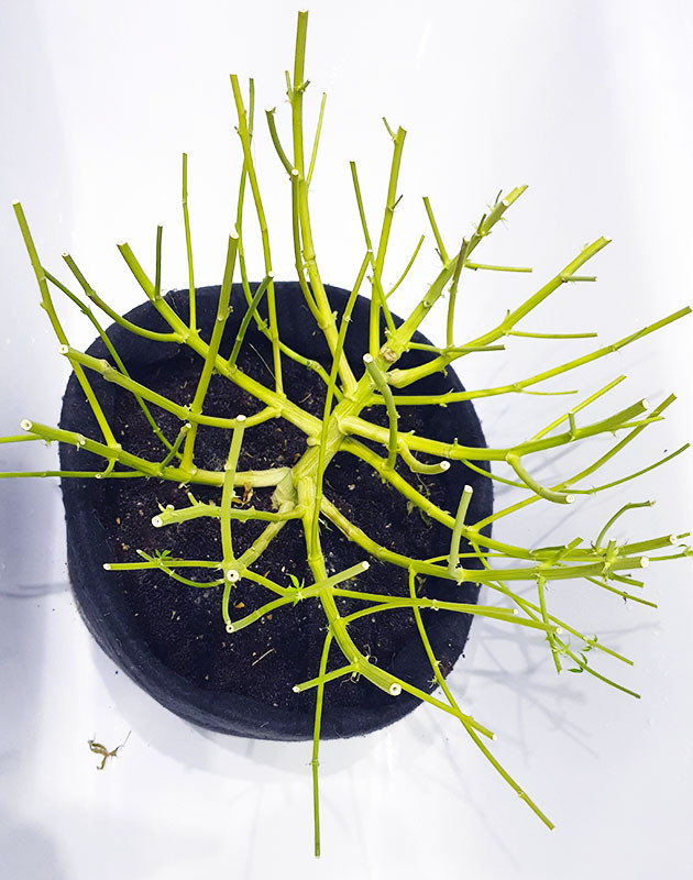 В начале третьей недели кустик переехал в 25-литровый горшок, в котором было 18 литров субстрата, состав расписывал выше. На 20-й день он подвергся первой тренировке. Я обрезал макушку по технологии фимминг. С самого начала недели после выключения света обрабатываю по листу из пульверизатора водой + G.O. Root Plus (3 мл/л). В конце недели после обрезки растишка получила компот уже с ppm 690.