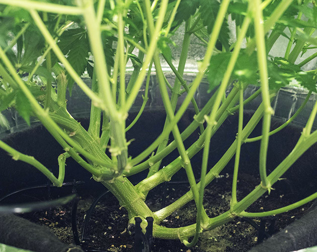 С четвертой недели начал тренировать кустик подгибом LST. Также использую методику Х-листа, перекрещивая большую листву между собой, таким образом создавая больше открытого пространства для света. Скрестил таким образом три пары. Растение хорошо реагирует на тренировки, быстро восстанавливается от обрезки, у него есть запас гибкости. Есть признаки небольшого недостатка фосфора, но скоро цветение, а там в подкормке его будет больше.
