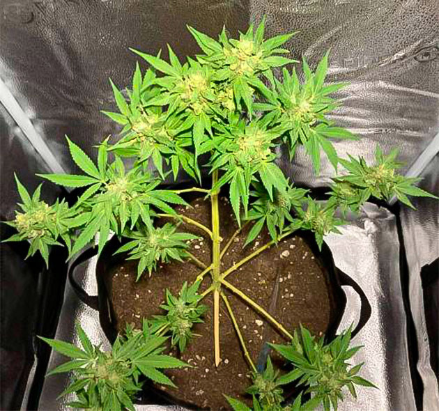 Началось активное цветение. Словно по команде кого-то важного сверху, Northern Lights 10 of 10 переключился на формирование соцветий. Не заставили себя ждать и первые белёсые пестики на верхушках побегов, своим появлением предваряющие скорое образование смолистых шишек. Куст остается весьма компактным, но при этом его структура меняется, боковые ветки тянутся к свету, образуя плотный зеленый купол. Опять проведена вынужденная дефолиация, приоткрывшая доступ потокам света и свежего воздуха к нижним ярусам. Полив постепенно сместился к преобладанию фосфорно-калийной подкормки с меньшим объемом азотных удобрений: