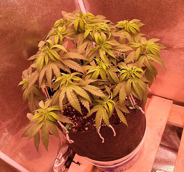 К концу второй недели растение показало первые пятипалые листья, а значит, начинаем считать старт вегетационного периода. Полив 350 мл, развитие идёт хорошо, но стоит отметить, что из перечисленной тройки самое слабое, но все же стабильно хорошо. Растение будет формироваться в стиле мейн лининг, первый топпинг произведём в маленьком горшке, после топпинга пересадим в окончательный горшок и начнём кормить стимуляторами по листу. Листы подкручивает из-за малого объёма горшка, корневой системе уже тесновато, но данный скрут пропадёт сразу после пересадки растения.