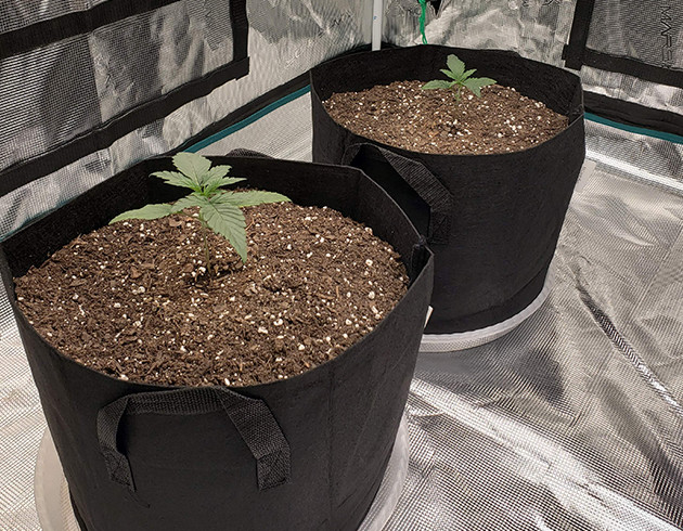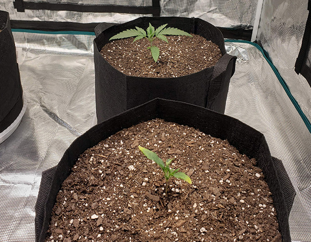Первая неделя прошла без всяких проблем. Саженцы скинули каски и к концу недели начали формировать второй этаж. Поливал по 300 мл вокруг растишек водой с откорректированным pH. Свет включен 24 часа, температура 23 °C, влажность 40-50 %. До ламп 50 сантиметров.