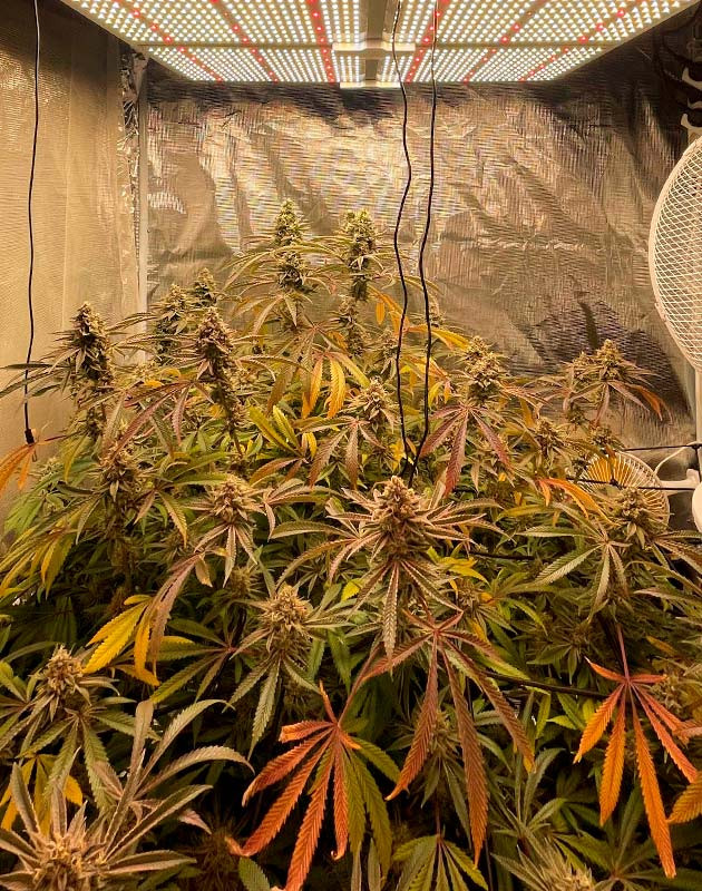 Учитывая обожженные удобрениями части куста, я начал постепенно удалять все больше и больше листвы. Таким образом, растение направит свой финальный рывок на соцветия, да и работать с кустом на харвесте будет проще. Хочу отметить, что в палатке не слишком сильный запах, несмотря на монструозный вид растения и огромное количество бутонов. Куст очень интересного цвета, фиолетово-красно-розового. Такого изменения цвета можно добиться не только ожогом удобрениями, но и значительными перепадами температур. Напомню, разница между днем и ночью составляет 12 градусов. С 20-й недели куст начал также получать Stimulator Super Boost PK в количестве 1 мл/л.