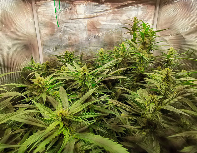Девятая неделя, растишки перестали тянуться, разница в росте сохранилась плюс-минус на том же уровне. Шишки завязались полностью, покрываются трихомами, а аромат стал гораздо интенсивнее и теперь приобрел запах то ли солярки, то ли бензина, то ли какой-то концентрированной химии. Очень резкий и специфический, но как бы намекает на то, что плохая ганджа так вонять не может. Однако я заметил, что листва слишком уж темная, что может свидетельствовать о переизбытке питательных веществ. Поэтому немного уменьшил концентрацию базы Grow и Bloom до 2 мл/л, Micro и Big Bud оставил по 3 мл/л. Разовый полив 1,5 литра, 3 раза в неделю.