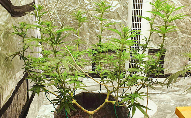 За неделю куст полностью восстановился от тренировки, и на 27-й день ему предстояло более серьезное испытание на жизнестойкость. Я провел еще один топпинг, удалил всю листву, оставив только по макушке на каждой ветке и по паре листьев на ней. Мейнлининг во всей красе.