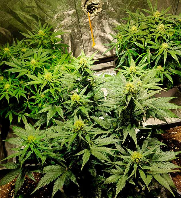 На 10-й неделе проверил трихомы при помощи ювелирной лупы. Они были мутно-молочными, на нижних ярусах еще оставалось немного прозрачных. Удалил значительную часть листвы с кустов, а вот верхние этажи трогать не стал, хоть они и начали обесцвечиваться. Счел это признаком не проблем, а скорого харвеста. Поэтому еще раз полил раствором с базой и стимулятором цветения, после чего приступил к промывке.