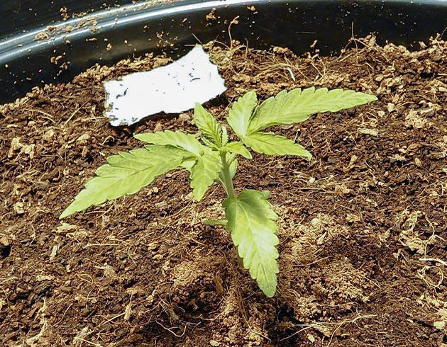 Под ДНаТ растишка чувствует себя вполне комфортно. Температура в боксе днем 25 °C, ночью опускается до 23 °C. Влажность не опускается ниже 55 %, что не может не радовать. Расстояние до лампы 50 сантиметров. Вода для полива отстоянная водопроводная, выровненная по pH до 6,5. Кустик развивается нормально, лезет первая пара пятипалых листьев.