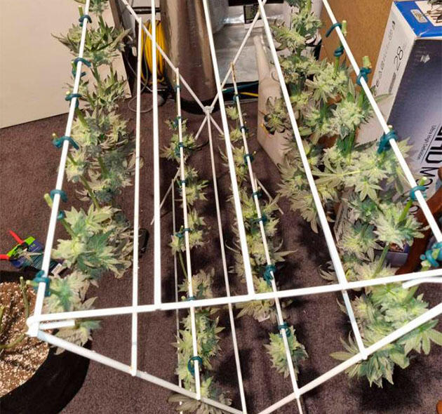 Я также продолжил планомерную работу по тренировке куста. Провел топпинг, параллельно сделал легкую дефолиацию, убрал несколько крупных листьев, которые затеняли нижние участки. Это открыло доступ света и воздуха к молодой листве. Также уделил время для продолжения LST.