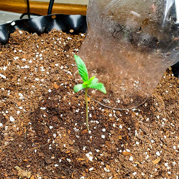 Понял, что растению сложновато находиться при влажности в 45 %, так что обрезал верхушку двухлитровой бутылки от колы и установил ее над саженцем в качестве портативного парника. Вместе с этим установил свет на 25 000 люкс. Через два дня листья поднялись вверх, как будто до этого она испытывала некий стресс. Я снова приглушил свет до 20 %, и все быстро вернулось в норму.