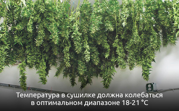 - Стабильно прохладная температура. Важно понимать, что в помещении должно быть достаточно прохладно. Старайтесь держать температуру не выше 18-21 °C. Придерживаясь этого диапазона, гровер добьётся равномерного и постепенного высыхания урожая.