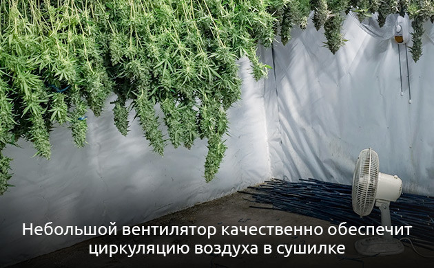 - Циркуляция воздуха. В помещении, где сушится урожай, будет очень кстати небольшой вентилятор, который обеспечит циркуляцию воздуха. Необходимо направить его в стену, но не прямо на шишки. Если же вы сушите урожай в своём гроубоксе, то с данной задачей отлично справится канальный вентилятор, включенный на малую мощность.