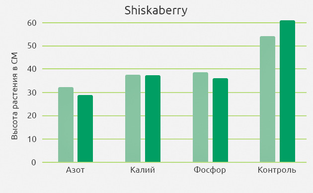 Отсутствие даже одного из базовых элементов питания стало причиной значительной задержки развития конопли, вследствие чего растения получились низкорослыми. Если сравнивать их с контрольными образцами, то последние обгоняли их в среднем в два раза.