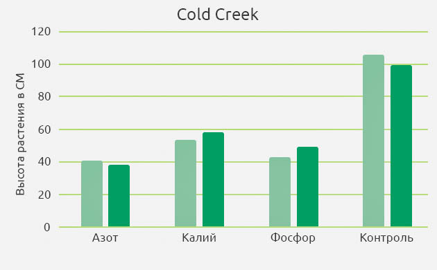 Практически идентичные результаты были получены и у растений Cold Creek Kush. В этом случае урожайность контрольного растения составила 120 граммов сухого продукта, а растение с дефицитом азота принесло лишь 4,5 грамма (снижение урожайности на те же 96 %).