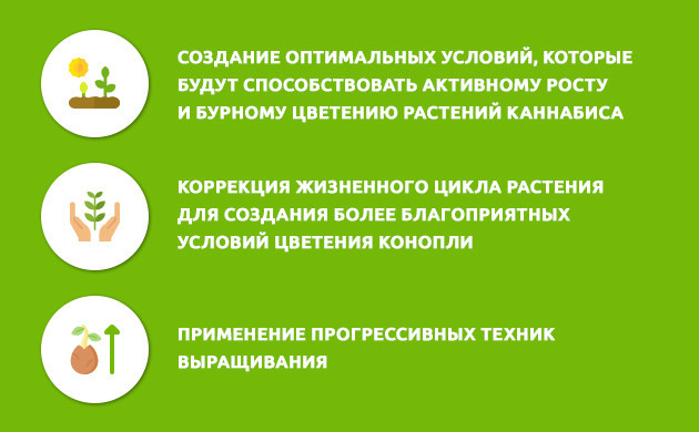 • Создание оптимальных условий, которые будут способствовать активному росту и бурному цветению растений каннабиса;