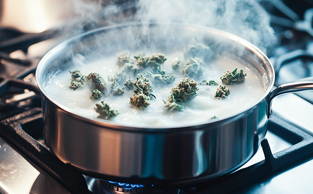 - Добавьте декарбоксилированные шишки в масло и варите на протяжении 2-3 часов, периодически помешивая, чтобы ничего не пригорело.