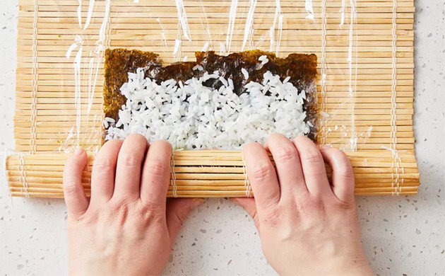 - Аккуратно сверните роллы с помощью коврика, слегка надавливая, чтобы форма хорошо держалась.
