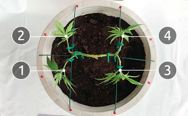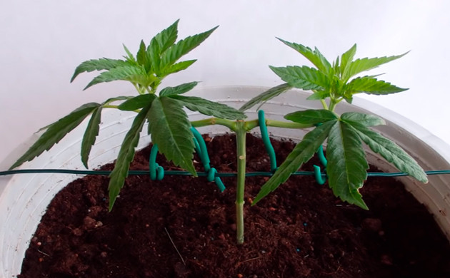 - Из оставленного узла должны исходить два новых боковых стебля. Ваша задача будет зафиксировать их под углом 90° к центральной коле. Подгибать стебли нужно аккуратно и не спеша. Не все сорта каннабиса легко переносят тренировки, какие-то ветви более хрупкие и попросту не перенесут резких движений. Даже если в процессе подгиба стебель надломился, зафиксируйте его в нужном положении, используя скотч или шнурок. Со временем он может прирасти обратно. Чтобы зафиксировать побеги, лучше использовать нетравматичный материал. Это должна быть достаточно толстая проволока в оплетке. Слишком тонкие нитки, лески или проволока могут передавить побег и препятствовать поступлению питательных веществ.