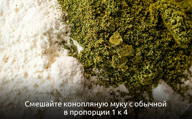 • Смешивайте конопляную муку с обычной. Оптимальная пропорция – 1 к 4, то есть необходимо смешивать 75 % обычной муки с 25 % канна-муки.