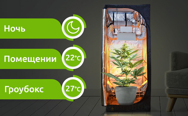 Если установить такой режим освещения, что период бодрствования кустов будет выпадать на ночное время суток, то пониженная температура воздуха нивелирует тепло от осветительных приборов в боксе, что обеспечит более комфортные условия для развития каннабиса. В полуденную жару, когда температура воздуха в помещении будет максимальной, выключенные лампы не будут сильно влиять на ситуацию. Если в придачу разместить бокс подальше от солнечных лучей, например в кладовке, то летняя жара вообще пройдет незамеченной.