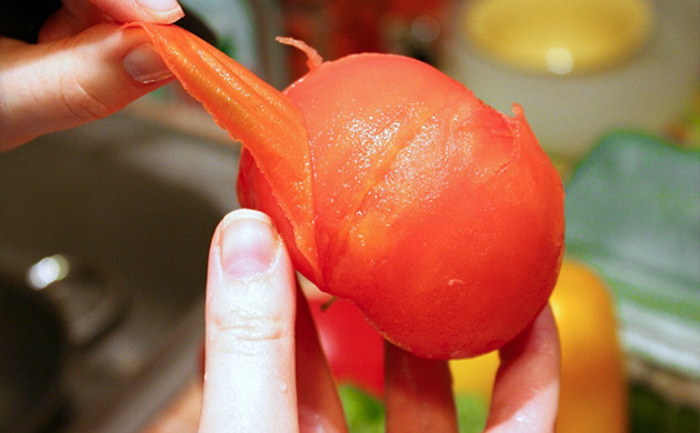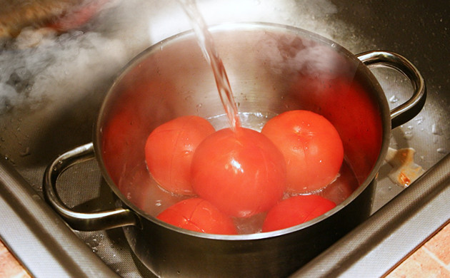 1. Помидоры нужно помыть и очистить от кожицы, что очень просто сделать, обдав их кипятком и подержав в горячей воде пару минут. Затем очищенные томаты нужно измельчить в блендере, на терке либо протереть через сито.