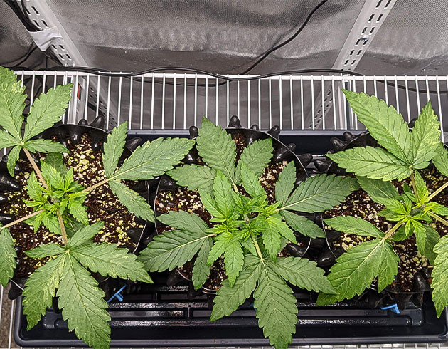 Вторая неделя, растихи в тех же мешочках, их рост 6,5 сантиметра. Свет включен 20 часов в сутки, температура днём 24 °C, ночью опускается до 21 °C. Температура воды для полива – 21 °C. Лампа включена на 50 %, с середины недели – на 60 %. На растихах сформировалось два этажа и завязался третий. Использую тот же набор удобрений, саженцы получают по 200 мл в сутки. Расписание по дням: