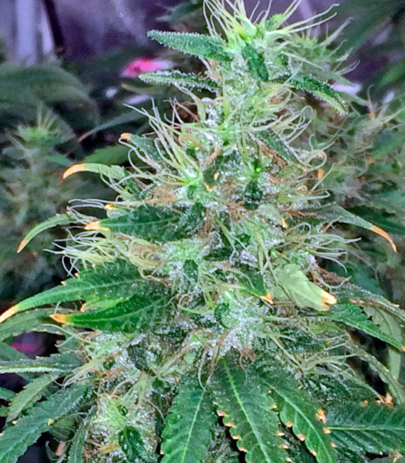 Это типичная Индика с мощной центральной колой, на которой растет большое количество широких насыщенно-зеленых листьев. Междоузлия достаточно короткие. Крупные шишки выделяют такое большое количество смолы, что растение очень скоро покрывается слоем «сахарной пудры», что в сочетании с оранжевым ворсом придает растишке особое очарование и красоту. В помещении гибрид вырастает до компактных 80-100 см, а вот в «ауте» – уже до внушительных 200-250 см. Период цветения очень короткий и составляет всего 55-60 дней.