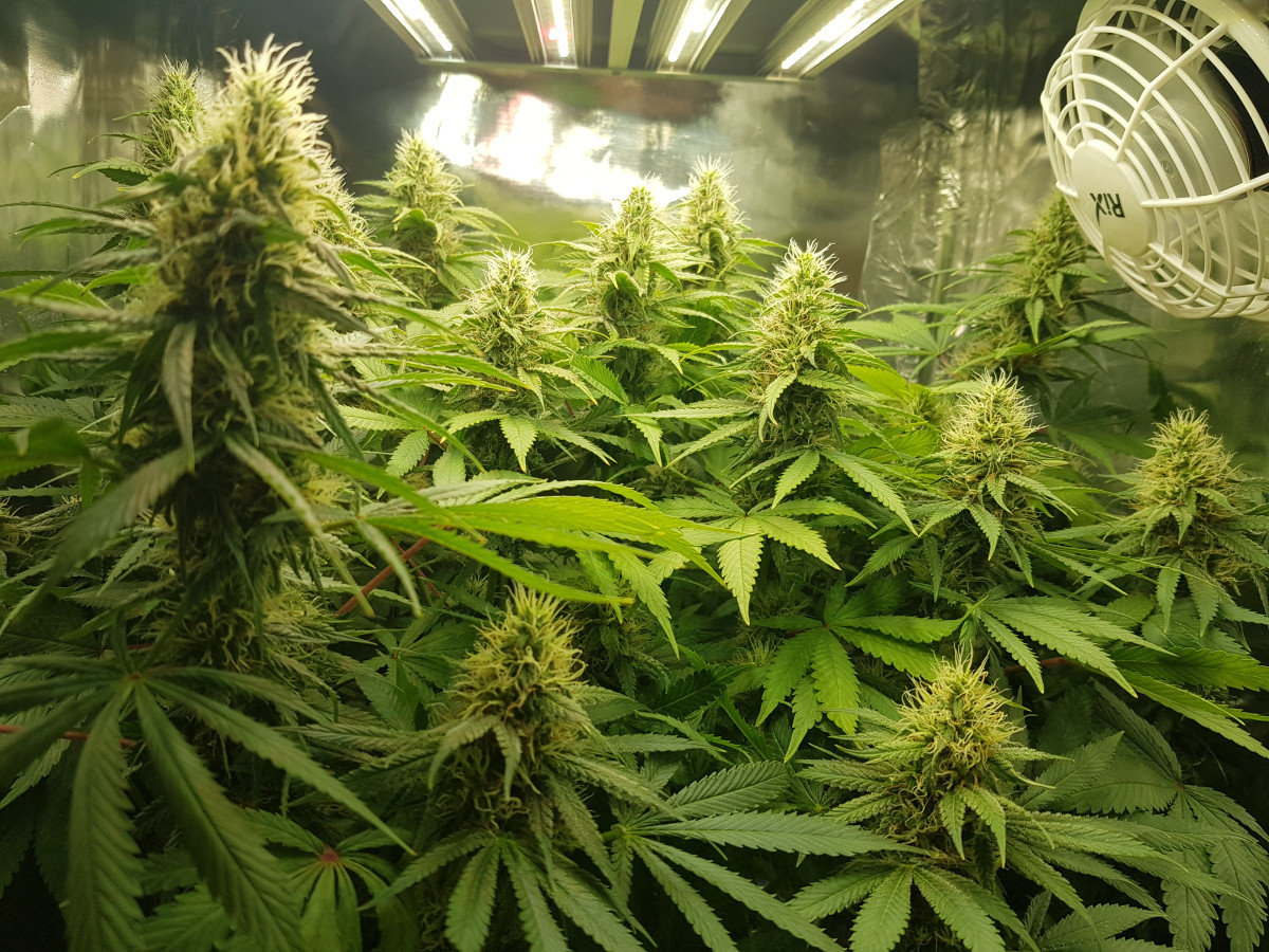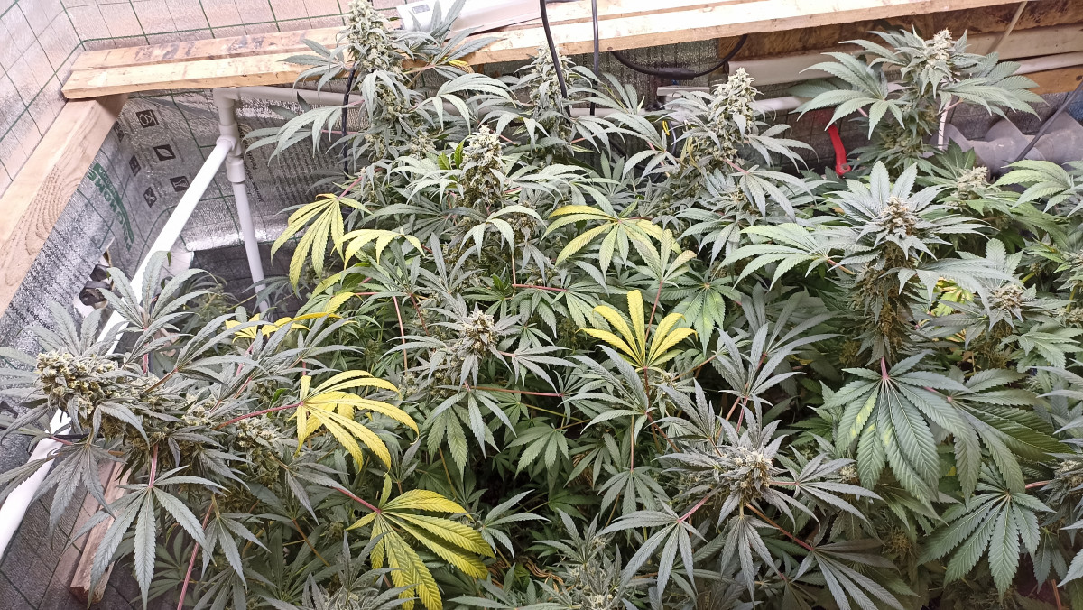 6-я неделя цвета/до этого 10 дней рассада и 4 недели веги топпинг(можно было б и не один..), практически постоянное ЛСТ, 3 дефолиации. Всё идеально вынесла) листики с веги и начала цвета уже присаживали на хихи!)
