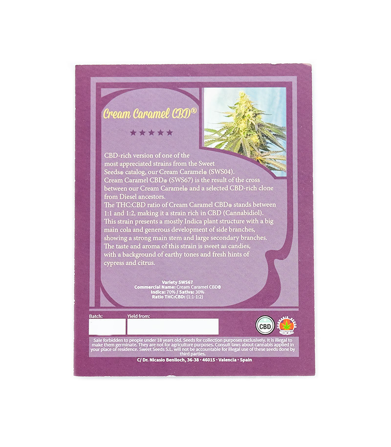 Сорт конопли Cream Caramel CBD от Sweet Seeds представляет собой медицинскую вариацию одного из самых популярных растений испанского сидбанка с одноименным названием. Селекционерам компании пришлось хорошо потрудиться, чтобы создать достойного родственника прославленному стрейну. Для этого они скрестили оригинальное растение со специально отобранным клоном с высоким показателем КБД, предком которого являлся легендарный Diesel. Благодаря усердным стараниям на свет появилось растение, готовый продукт которого обладает соотношением ТГК к КБД от 1:1 до 1:2. Оно отличается также умеренной неприхотливостью в уходе, хорошими показателями урожайности и крепкой структурой кустов.
