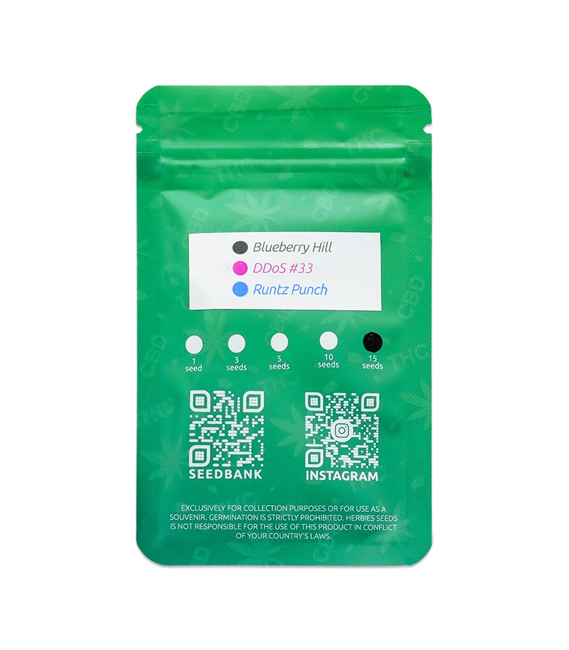Коллекция феминизированных семян конопли Fem Mix Pack #1 – отличная возможность познакомиться с лучшими сортами от сидбанка Herbies Seeds. Испанская компания включила в этот микс по 5 семян трёх сортов – Blueberry Hill, DDoS #33 и Runtz Punch. Все растения подходят для выращивания как под искусственным светом в индоре, так и в естественных условиях в открытом грунте. Все три сорта являются индико-доминантными гибридами и выведены на основе отборных генетик.