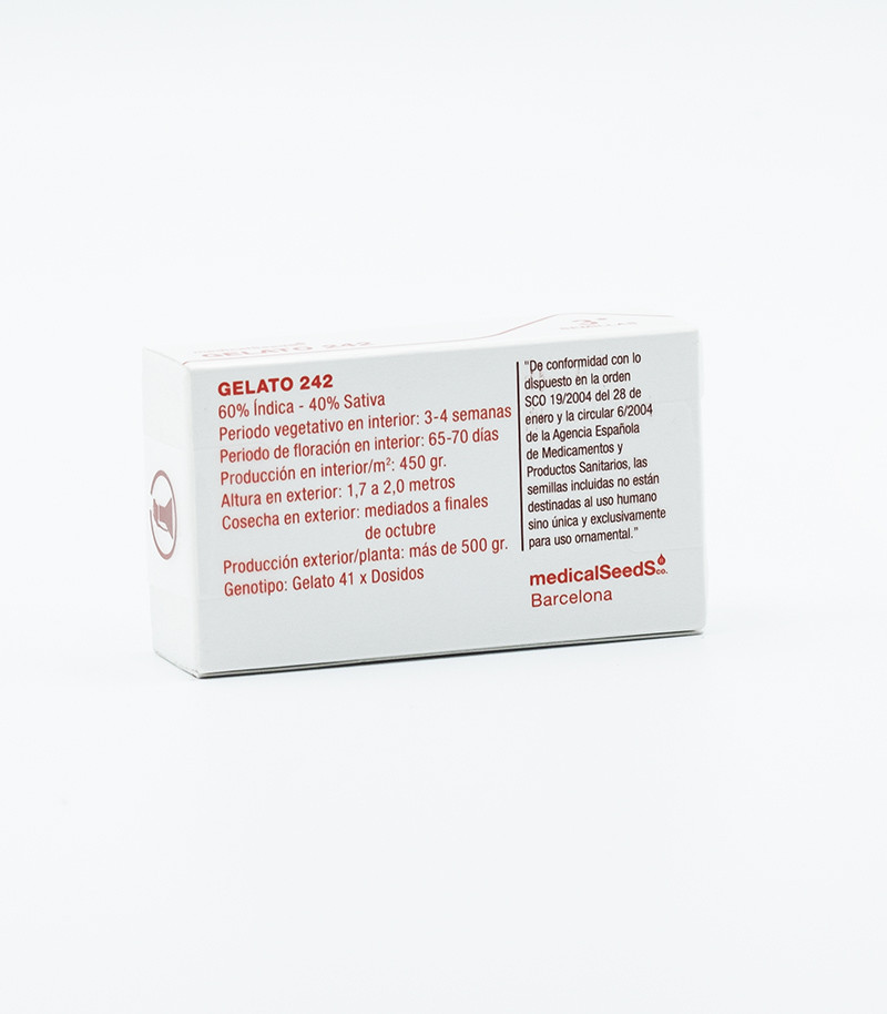 Семена конопли Gelato 242 были получены бридерами сидбанка Medical Seeds путём скрещивания двух первоклассных родительских генетик, которые пользуются широкой популярностью в США. Селекционеры использовали Gelato 41 (кросс Sunset Sherbet и Girl Scout Cookies) и Do-Si-Dos (кросс Girl Scout Cookies и Face Off OG). От первого родителя сорт унаследовал изысканный аромат, а от второго – повышенную смолистость и высокое содержание ТГК. Скрещивание этих сортов определило генотип Gelato 242 – 60% Индика и 40% Сатива.