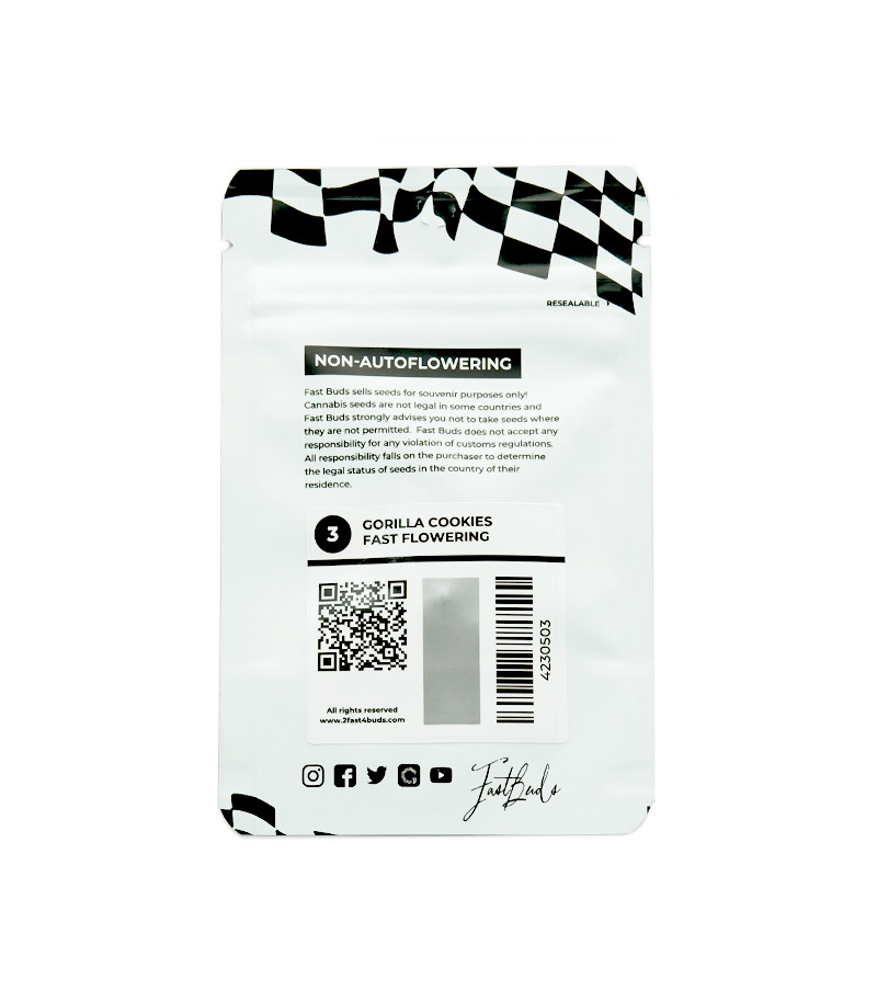 Сорт конопли Gorilla Cookies FF от американской семенной компании FastBuds. Совсем недавно они выпустили на рынок первую линейку фотопериодных сортов со скоростным цветением и высокой производительностью. В основу гибрида Gorilla Cookies FF легли отобранные вручную растения Girl Scout Cookies, Gorilla Glue #4 и Gorilla Cookies Auto, которые прошли многоэтапное скрещивание и стабилизацию, чтобы вы могли насладиться быстрым и беззаботным ростом конопли. Как и прародители, сорт обладает исключительным вкусом, отличается высоким содержанием ТГК и щедрой урожайностью.