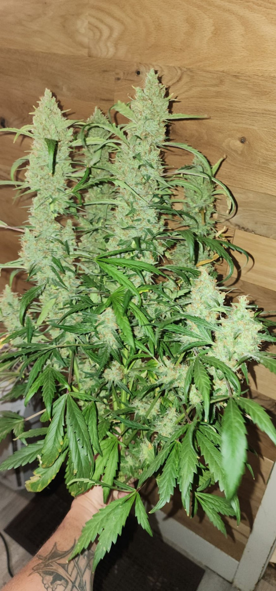 Всего 1 растение в горшке емкостью 3 галлона, и она дала мне чуть более 85 граммов или 3 унций. Она была выведена для сильной морозности и большого количества развивающихся бутонов, кем бы она ни была, она пахнет великолепно.