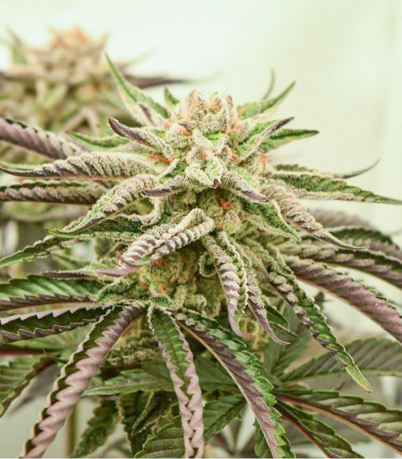 Первая лавина восхищения сортом Mimosa Evo накрывает гровера еще на этапе выращивания. С началом цветения его листья приобретают насыщенный фиолетовый оттенок, а толстый ковер сверкающих трихом делает бутоны похожими на редкие коллекционные аметисты.