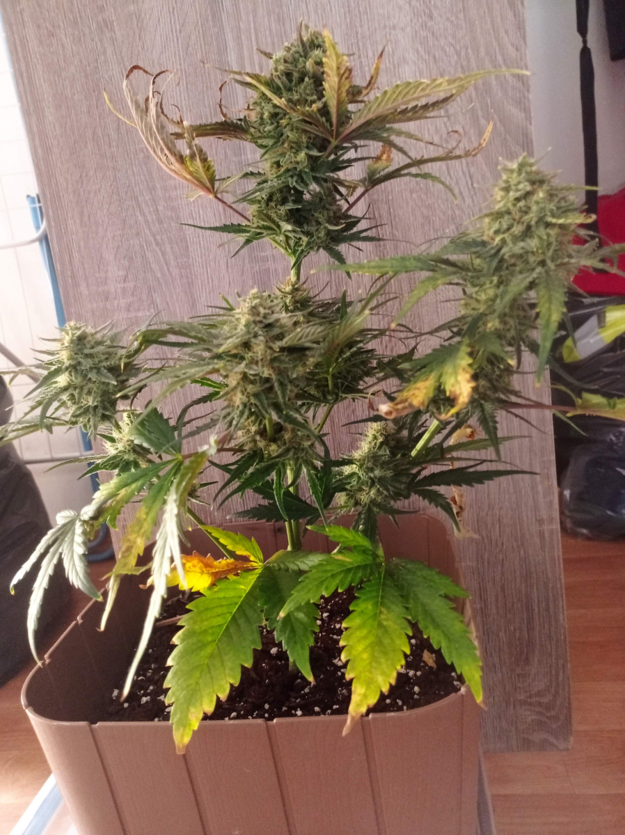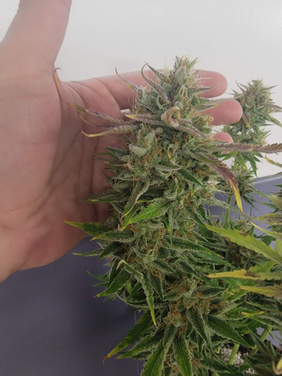 Если бы не испытанные кустом стрессы, он был бы намного больше. Но мне все равно очень нравится его внешний вид. У него плотные красивые шишки, а еще это очень выносливый и быстрый сорт. Рекомендую всем попробовать.