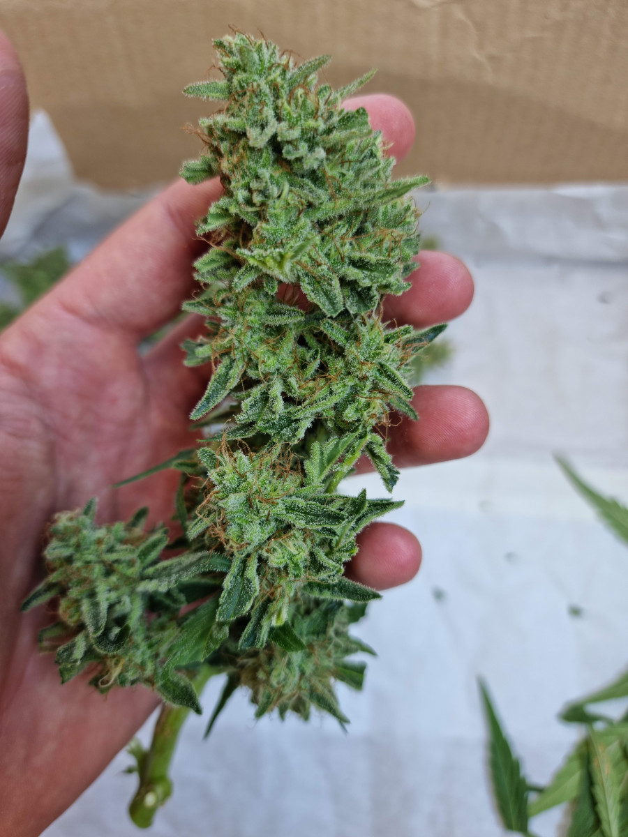 Гров и обрезка обрезка этого растения были легкими. У этого сорта отличное соотношение листьев и бутонов. Листвы мало, что сделало обрезку невероятно быстрой!! Влажный вес шишек составлял около 730 граммов, а после 6 дней сушки и 40 дней пролечивания вес сухих, твердых и покрытых инеем шишек составил 135 граммов! И это все 1 куст!