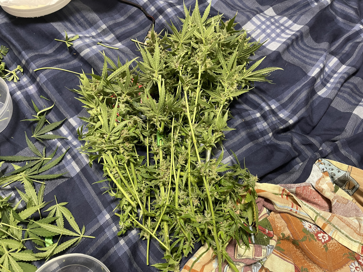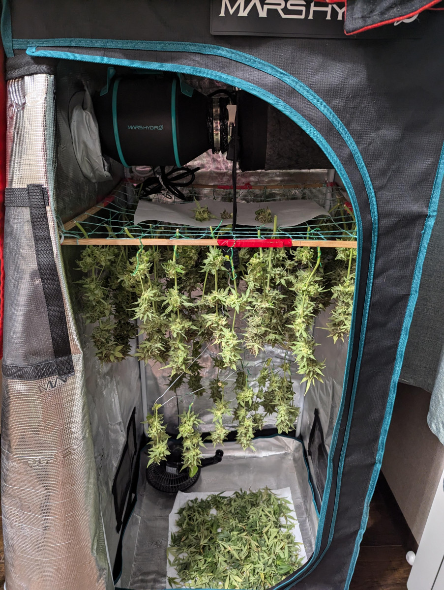 Сбор урожая был на 91-й день. Срезали растение по веткам, сделали частичную обрезку и повесили в гроубокс сушиться. Листья после обрезки я решил тоже высушить, так как листьев было много с трихомами. Я сделаю из них кано-масло для кексов и печенья. Температура 24°С, влажность 65%.